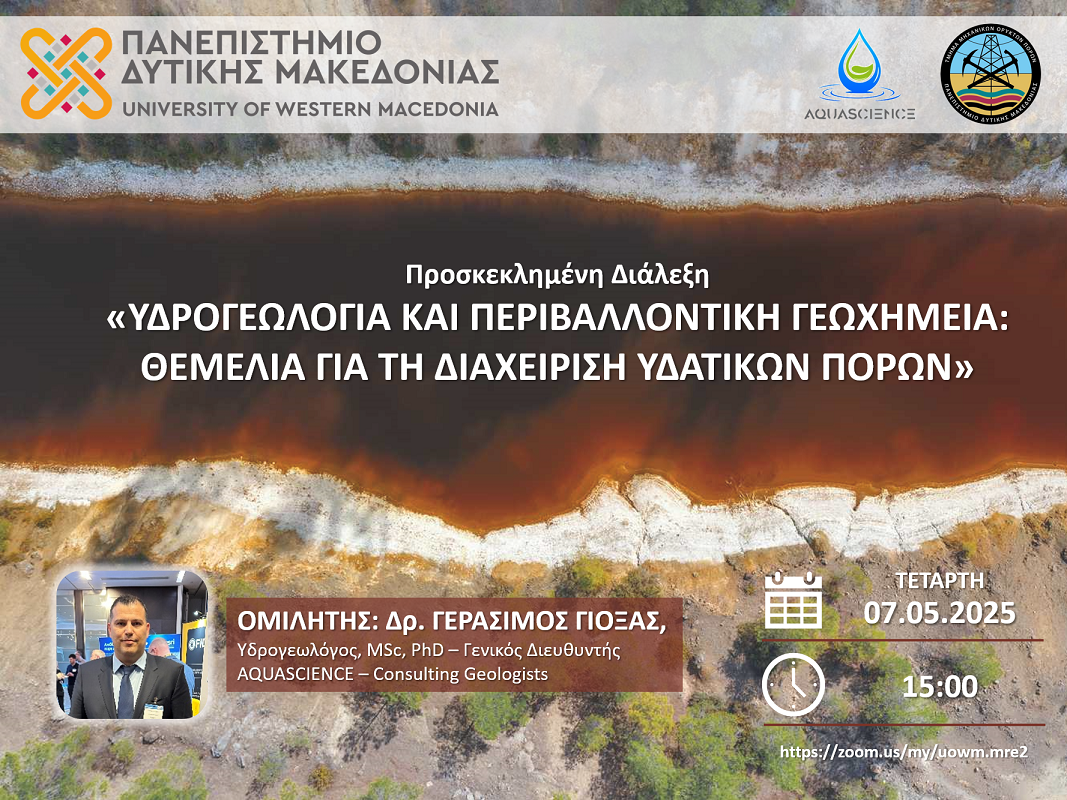 Την Τετάρτη 7 Μαΐου και ώρα 15:00μμ, στο πλαίσιο του μαθήματος “Περιβαλλοντική Γεωχημεία” θα έχουμε τη χαρά και την τιμή να φιλοξενήσουμε τον Γενικό Διευθυντή της AQUASCIENCE, Δρ. Γεράσιμο Γιόξα σε μια πολύ ενδιαφέρουσα διαδικτυακή διάλεξη με θέμα “Υδρογεωλογία και Περιβαλλοντική Γεωχημεία: Θεμέλια για τη Διαχείριση Υδατικών Πόρων”. Η διάλεξη θα είναι ανοιχτή για το κοινό μέσω του παρακάτω συνδέσμου στη διαδικτυακή αίθουσα MRE2.