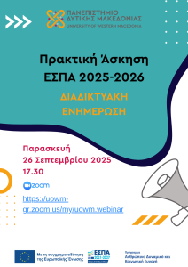 Η Επιστημονικά Υπεύθυνη της Πράξης «Πρακτική Άσκηση του Πανεπιστημίου Δυτικής Μακεδονίας ακαδ. ετών 2024-2027» Καθ. Δόμνα Μιχαήλ και το Γραφείο Πρακτικής Άσκησης της Μονάδας Υποστήριξης Φοιτητών (ΜΥΦ), προσκαλούν τους φοιτητές και τις φοιτήτριες, καθώς και τους/τις Τμηματικά Υπεύθυνους/ες Πρακτικής Άσκησης όλων των Τμημάτων του Πανεπιστημίου Δυτικής Μακεδονίας στην Διαδικτυακή Ενημέρωση για την Πρακτική Άσκηση ΕΣΠΑ 2025-2026, η οποία θα πραγματοποιηθεί: