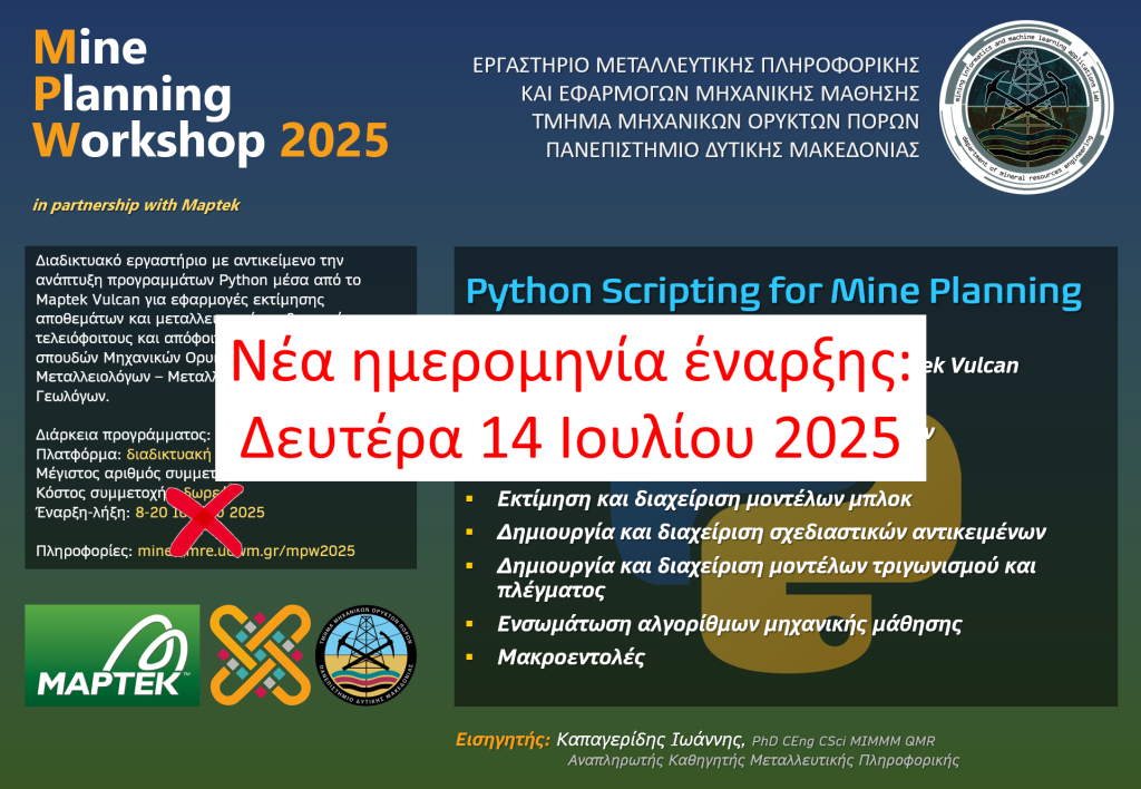 Η έναρξη του Mine Planning Workshop 2025, μεταφέρεται τη Δευτέρα 14 Ιουλίου λόγω διαδικασίας πιστοποίησης προγράμματος μεταπτυχιακών σπουδών, για την οποία ενημερωθήκαμε την περασμένη εβδομάδα από την ΕΘΑΑΕ, και η οποία πρόκειται να πραγματοποιηθεί 7-12 Ιουλίου. Οι συμμετέχοντες θα ενημερωθούν και μέσω email.